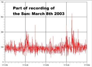 To complete the apparatus I have recently begun to feed the sounds via the earpiece jack to a simple audiocassette recorder then play them back through the sound card of my PC. This allows me to run the emissions through Radio Sky’s Radio-Sky Pipe software to create a visual and measurable record.